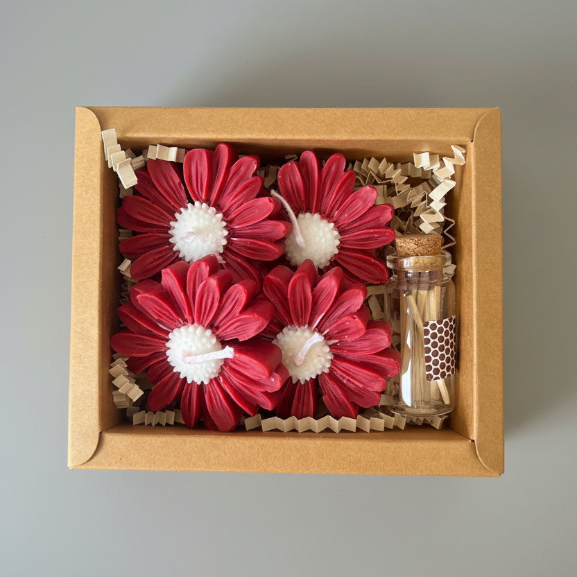 Margaritas Love es una propuesta delicada y luminosa que celebra la belleza natural de las flores y los pequeños rituales cotidianos. Compuesto por cuatro velas flotantes en forma de margarita, con pétalos rojos y centro blanco, este set aporta un contraste armónico y un toque floral elegante que realza cualquier espacio.