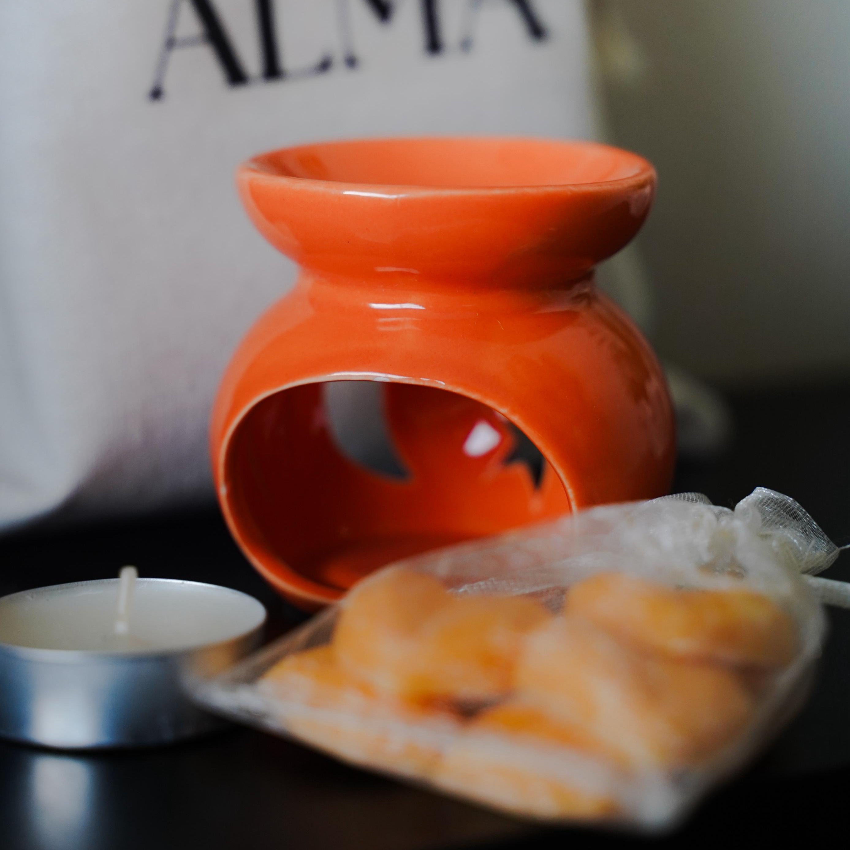 Kit incluye: Bolsa de Tela, 4 un velas de té, Quemador de Cerámica y 10 un velas wax melts